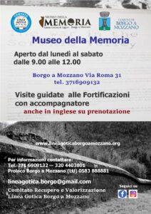 Il museo è aperto solo la mattina dal lunedì al sabato dalle ore 9.00 alle 12.00. Le visite guidate alle fortificazioni della Linea Gotica vengono fatte anche in giorni e orari differenti su prenotazione.A chi fosse interessato ricordiamo che domenica 14 dicembre con partenza alle 9.30 dal museo in via Roma 31 a Borgo a Mozzano è programmata la visita guidata al museo e a 3 bunkers in località Mao Pozzori e Anchiano.